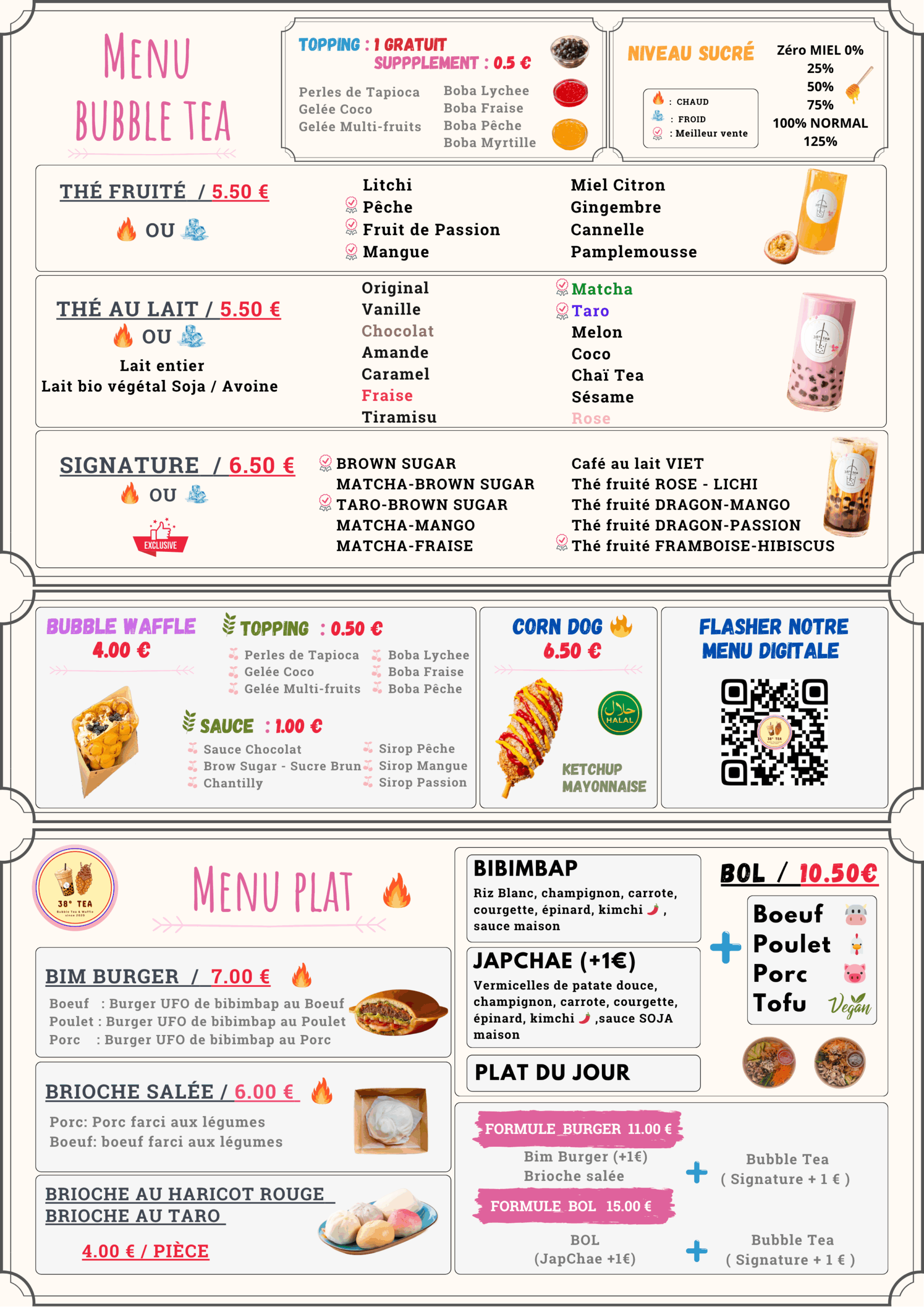 Chez 38° Tea, nous ne nous contentons pas de vous offrir une délicieuse sélection de Bubble Tea, nous vous proposons également une gamme d’accompagnements savoureux. Dégustez nos plats asiqatiques fusions tel que Bibimbap, Japchae (vermicelles de patate douce), Burger fusion ou des brioches moelleuses, pour une fusion parfaite de saveurs asiatiques.